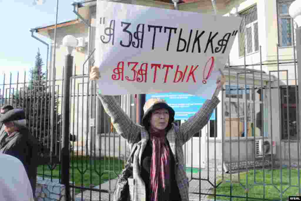 Акциянын катышуучулары “Азаттыкка" – азаттык", “Руки прочь от правды”, “Азаттык обого чыксын”, “Баардыгынын оозун баса албайсың”,-деген жазуулары бар плакаттарды кармап чыгышты.