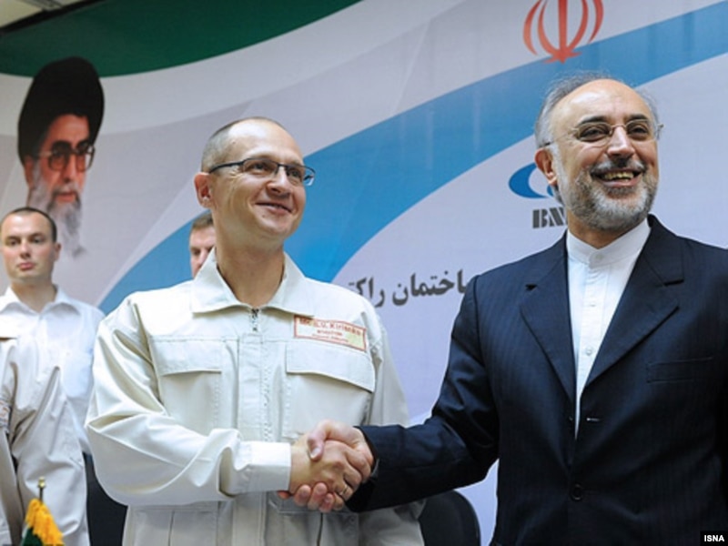 Россиянын атомдук энергия агенттигинин башчысы Сергей Кириенко(солдо) жана Ирандын атомдук энергия уюмунун башчысы Али Акбар Салехи(оңдо). Бушехр АЭСиндеги салтанатта. 21-август 2010.