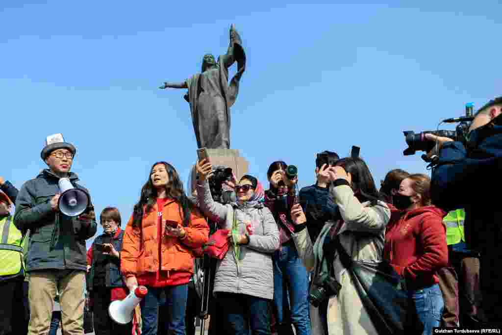 Уркуя Салиева атындагы «Революция каармандарынын» эстелигинин жанында аялдардын укуктарын коргоо акциясы өтүп, анда «Зордук-зомбулукка каршы!», «Эки жүздүүлүккө каршы!» деген өңдүү ураандар чакырылды. Акция саат 12:00до башталды.
