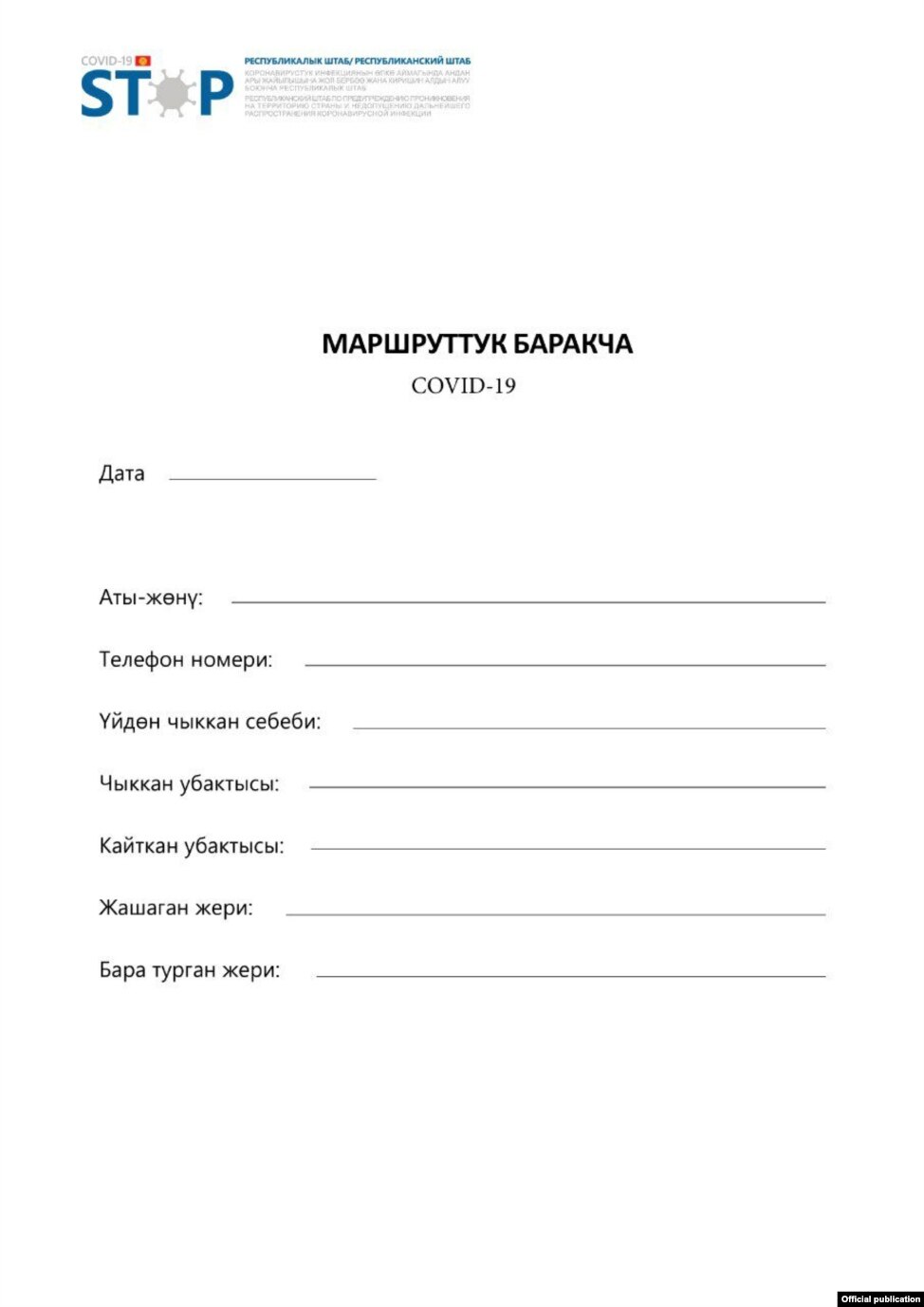 Жогорудагы себептер менен чыга турган болсоңуз жаныңызда маршруттук баракча жана тек-жайыңызды тастыктаган документ колуңузда болууга тийиш. Баракчада төмөнкү маалыматтар болушу керек.