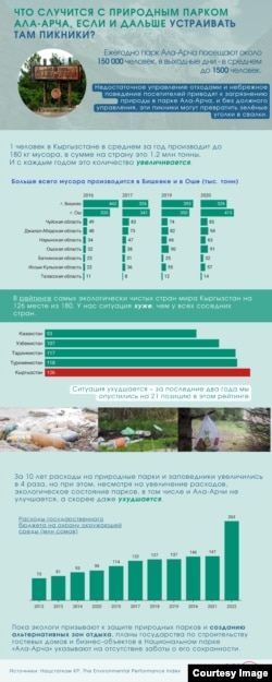 “Мындан 10-15 жыл мурда “Ала-Арча” суу сактагычы шаардыктар үчүн эс алуу жайы болгон, ал жер азыр таштандыга толуп жатат. "Ала-Арча” паркы макамы боюнча эс алууга ылайыкташпаган. Антропогендик таасир бул жайды келечекте Ала-Арча суу сактагычынын абалына алып келип коюшу мүмкүн. Ошол себептүү экологдор паркты бизнес-объектиге айландырууга каршы болууда”, - деди Көчөрова "Азаттыкка" кат түрүндө берген маегинде.