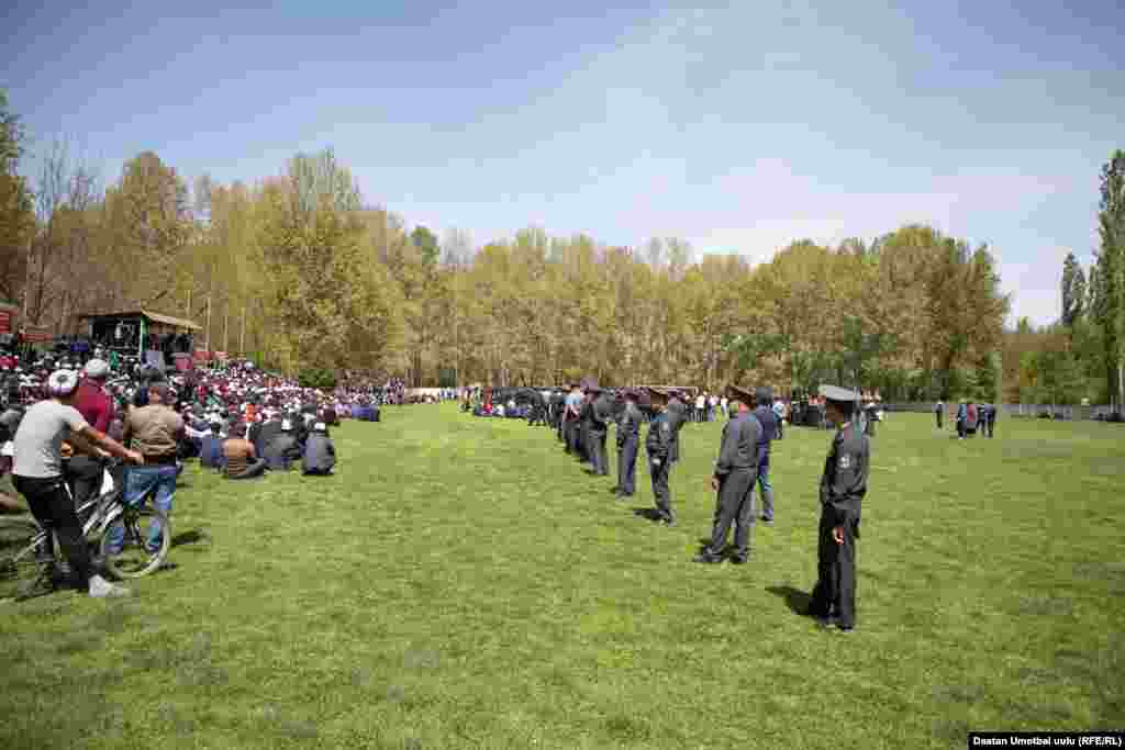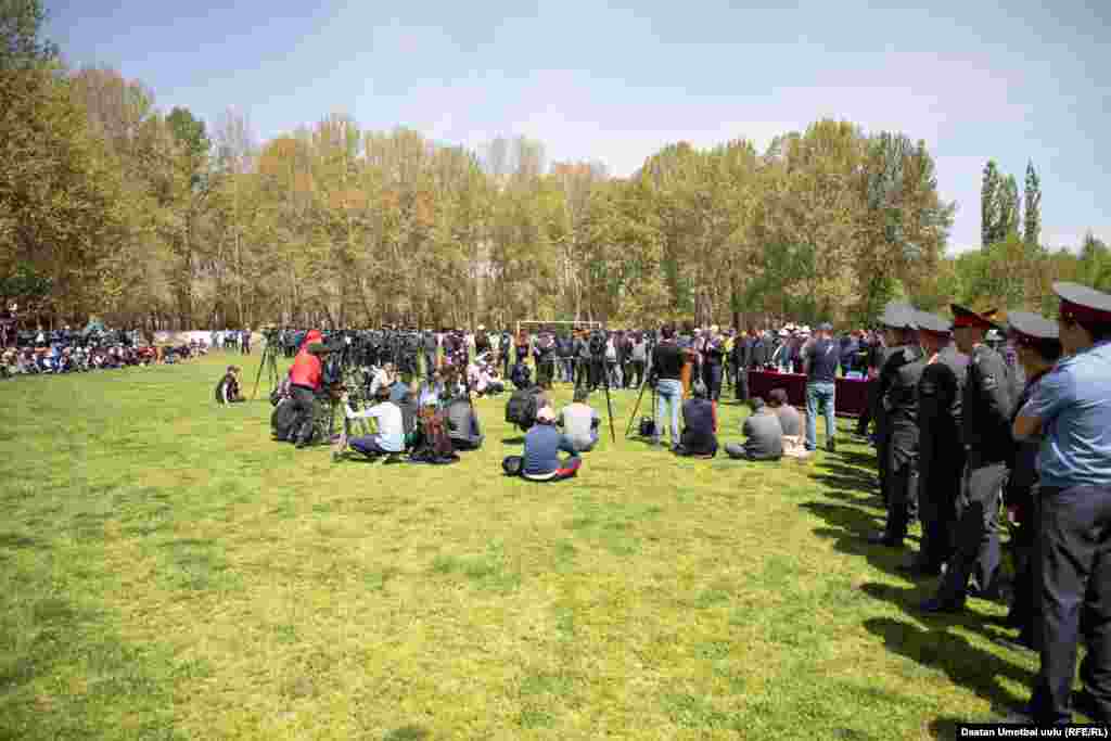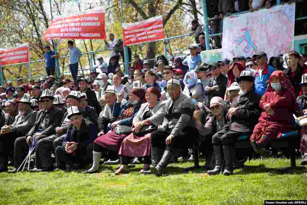 Нааразы болгон жүздөгөн тургундар Куршаб айылындагы стадионго чогулушту.