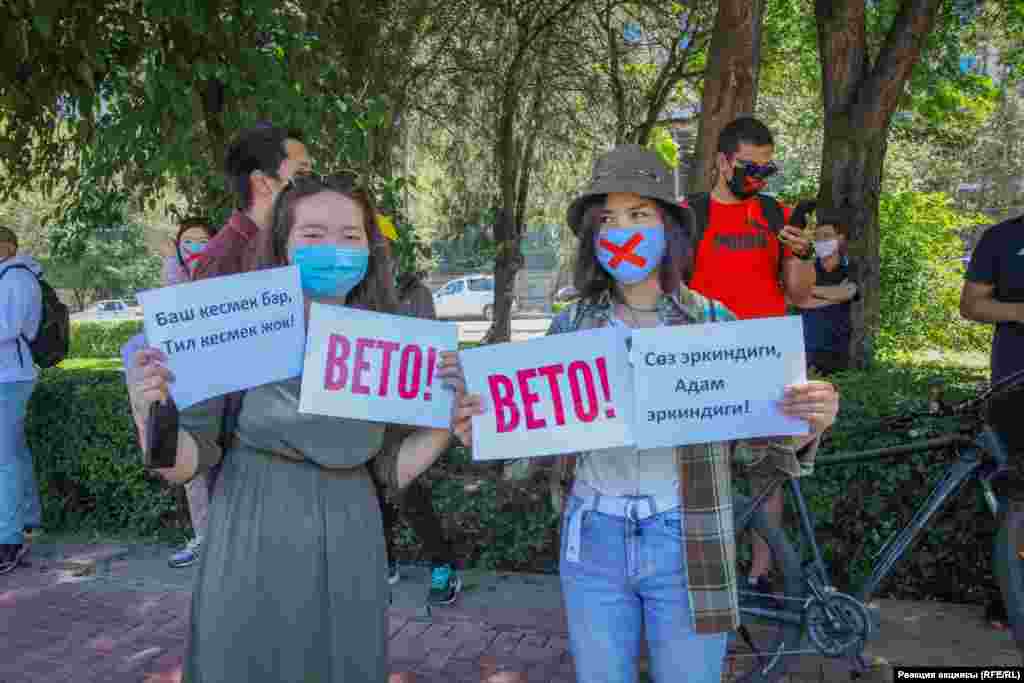 Акциянын катышуучулары "Гүлшат, мандатты тапшыр!", "Фейк депутат", "Вето!" деген жазууларды көтөрүп турду. Ошондой эле "Баш кесмек бар, тил кесмей жок", "Эркин сөз - эркин эл", "Гүлшат - фейк депутат, мандат тапшыр!", "Кворум жок - мыйзам жок", "Элге каршы мыйзам жок!", "Сөз эркиндиги - адам эркиндиги" деген ураандарды чакырышты.