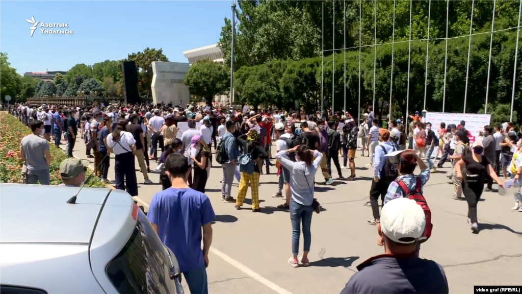 “Эркиндик!” деп чакырык таштаган митингчилер Эркиндик гүл багынан Акүйдүн алдына жөө жүрүш менен келишти.