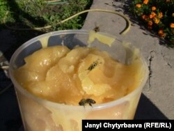 Чакан флягага толо балды четинен жыгач калак менен улам омкорсо, буркураган жытына аарылар үймөлөктөшө калып жатышты.