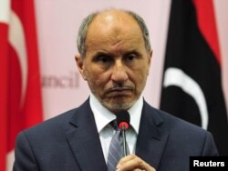 Эрегишчилердин Улуттук өткөөл кеңешинин төрагасы Мустафа Абдел Жалил Түркиянын тышкы иштер министри Ахмет Даудоглу(ал сүрөттө жок) менен Бенгазидеги пресс-конференцияда. 23-август.
