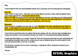 Coca-Cola компаниясынын бөлөк жетекчилерине жөнөткөн электрондук каттарында Бозер Каримова менен кандайдыр бир сүйлөшүүлөрдү жүргүзгөнү тууралуу маалыматтарды жалганга чыгарган. А бирок анын өзбек телекоммуникациялык Uzdunrobita компаниясын жетектеген америкалык кесиптеши менен жазган ички каттары баарысы тескерисинче болгонун күбөлөйт.
